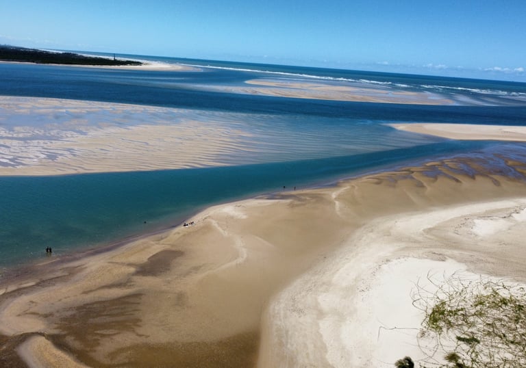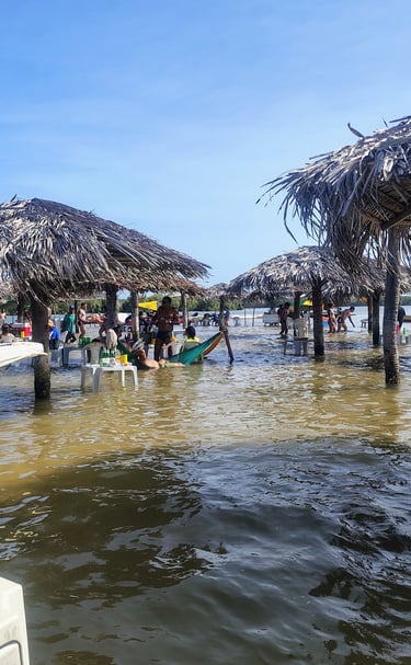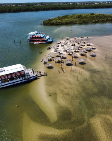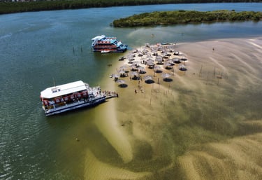 Banco de areia com restaurante, jet-ski e stand up paddle para diversão.